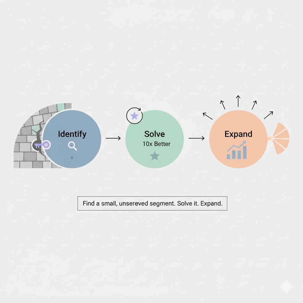 Identify → Find a small, underserved segment with a pressing problem.